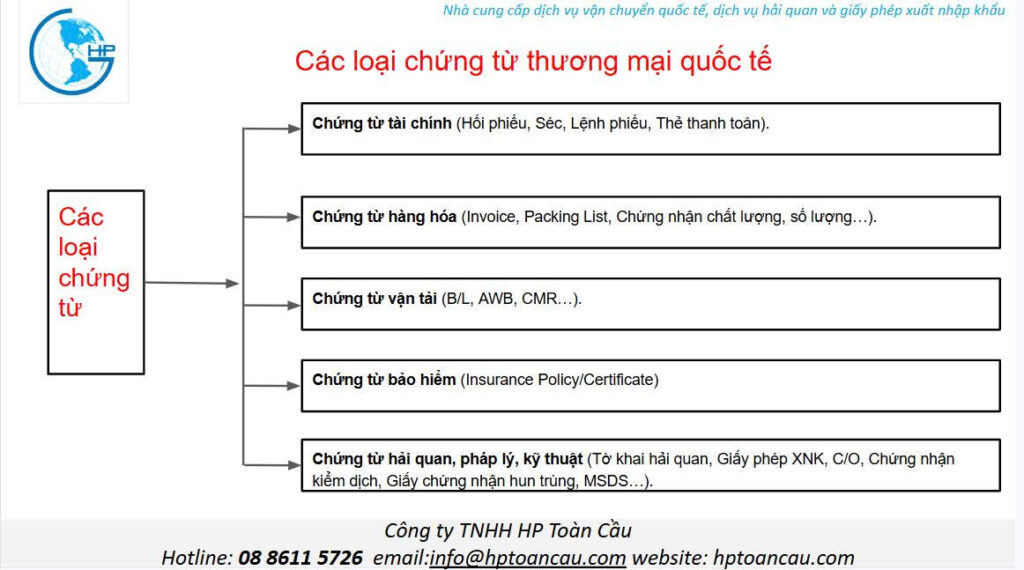 Chứng từ thương mại: bao gồm hóa đơn thương mại (Commercial Invoice), phiếu đóng gói (Packing List), chứng từ vận tải (vận đơn đường biển, vận đơn hàng không…), chứng từ bảo hiểm, chứng nhận xuất xứ (C/O), chứng nhận kiểm dịch, giấy phép xuất nhập khẩu, tờ khai hải quan…