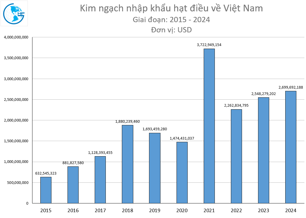 Kim ngạch nhập khẩu hạt điều của Việt Nam qua các năm: