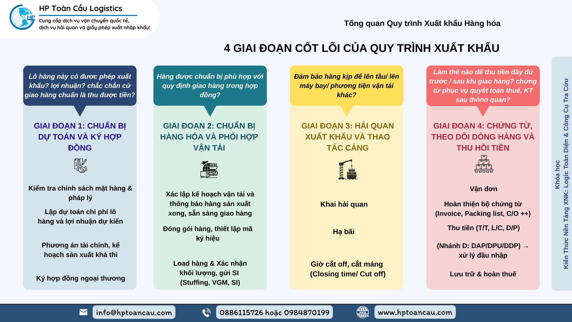 | Giai đoạn | 1. CHUẨN BỊ & KÝ KẾT | 2. LOGISTICS & ĐÓNG HÀNG | 3. THÔNG QUAN & HẠ BÃI | 4. CHỨNG TỪ & THU TIỀN |