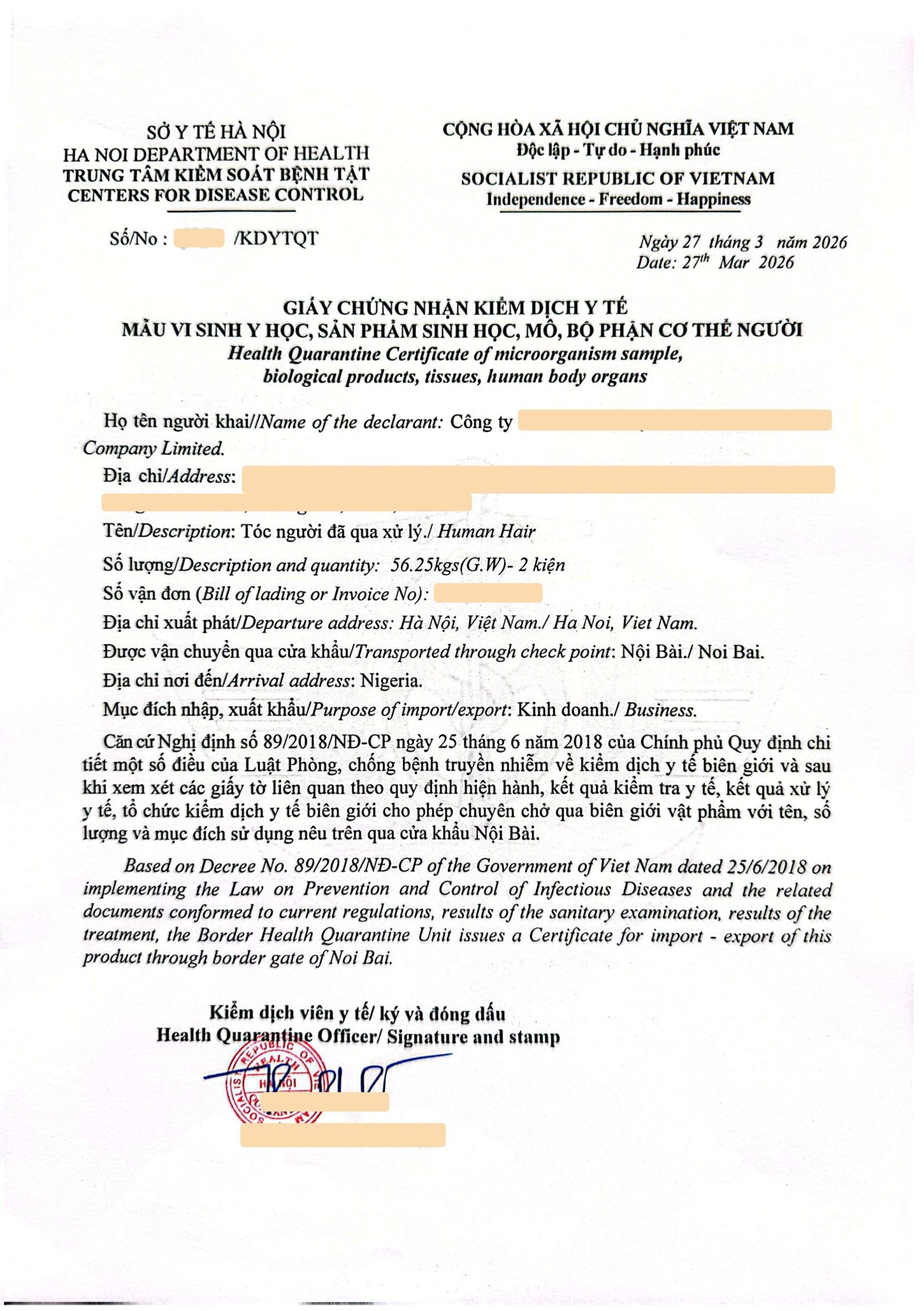 🏢 CÔNG TY TNHH HP TOÀN CẦU Dịch vụ Vận chuyển quốc tế | Thủ tục Hải quan | Giấy phép Xuất nhập khẩu 📞 Hotline: 0886115726 – 0984870199 | 🌐 Website: www.hptoancau.com ✉️ Email: info@hptoancau.com | 📍 Địa chỉ: Số 13, LK3-NO03, Khu đô thị Văn Khê, Hà Đông, Hà Nội ► Liên hệ ngay để được tư vấn miễn phí về lô hàng xuất khẩu tóc người đã qua sơ chế của bạn |