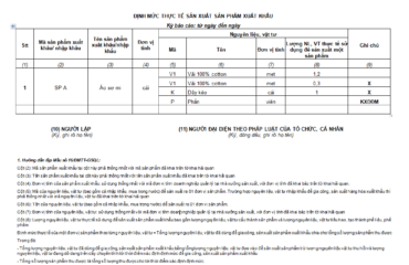 - Danh mục, số lượng, trị giá nguyên liệu, phụ liệu, vật tư nhập khẩu và nguyên liệu, phụ liệu, vật tư sản xuất trong nước (nếu có) để gia công; định mức sử dụng nguyên liệu, phụ liệu, vật tư; định mức vật tư tiêu hao và tỷ lệ hao hụt nguyên liệu trong gia công.