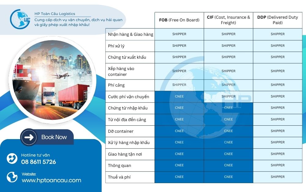 FOB (Free On Board): Người bán chịu chi phí và rủi ro đến cảng xuất Việt Nam, phần còn lại thuộc trách nhiệm người mua