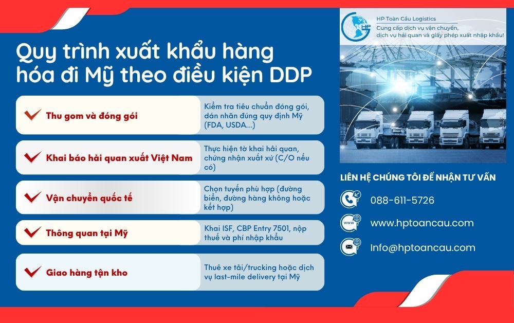 Dưới đây là 5 bước cơ bản trong quy trình xuất khẩu 1 lô hàng DDP đi Mỹ, do HP Toàn Cầu tổng kết qua kinh nghiệm thực tiễn xử lý hàng hóa: