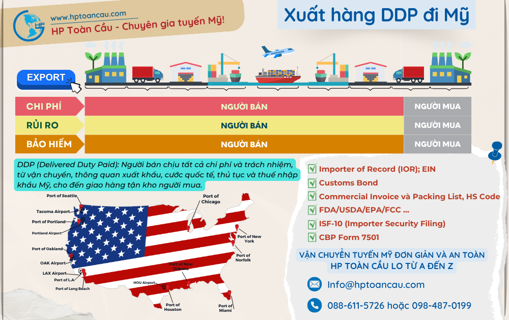 DDP (Delivered Duty Paid): Người bán chịu tất cả chi phí và trách nhiệm, từ vận chuyển, thông quan xuất khẩu, cước quốc tế, thuế nhập khẩu Mỹ, cho đến giao hàng tận kho người mua.