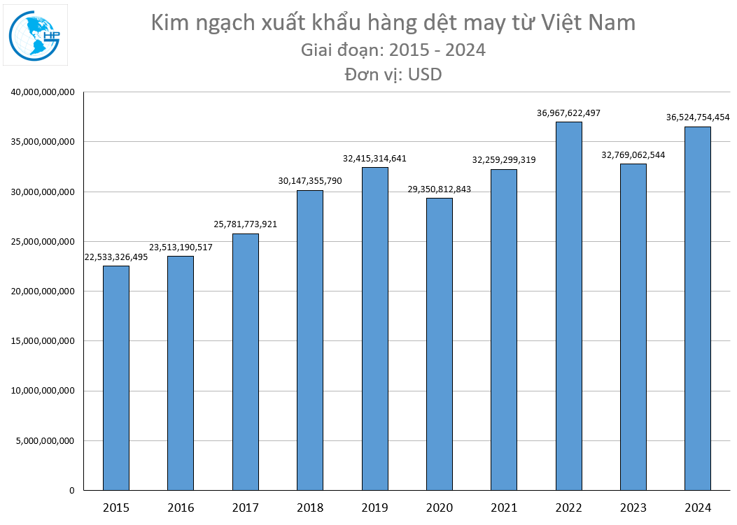 Kim ngạch xuất khẩu Mặt hàng may mặc của Việt Nam qua các năm: